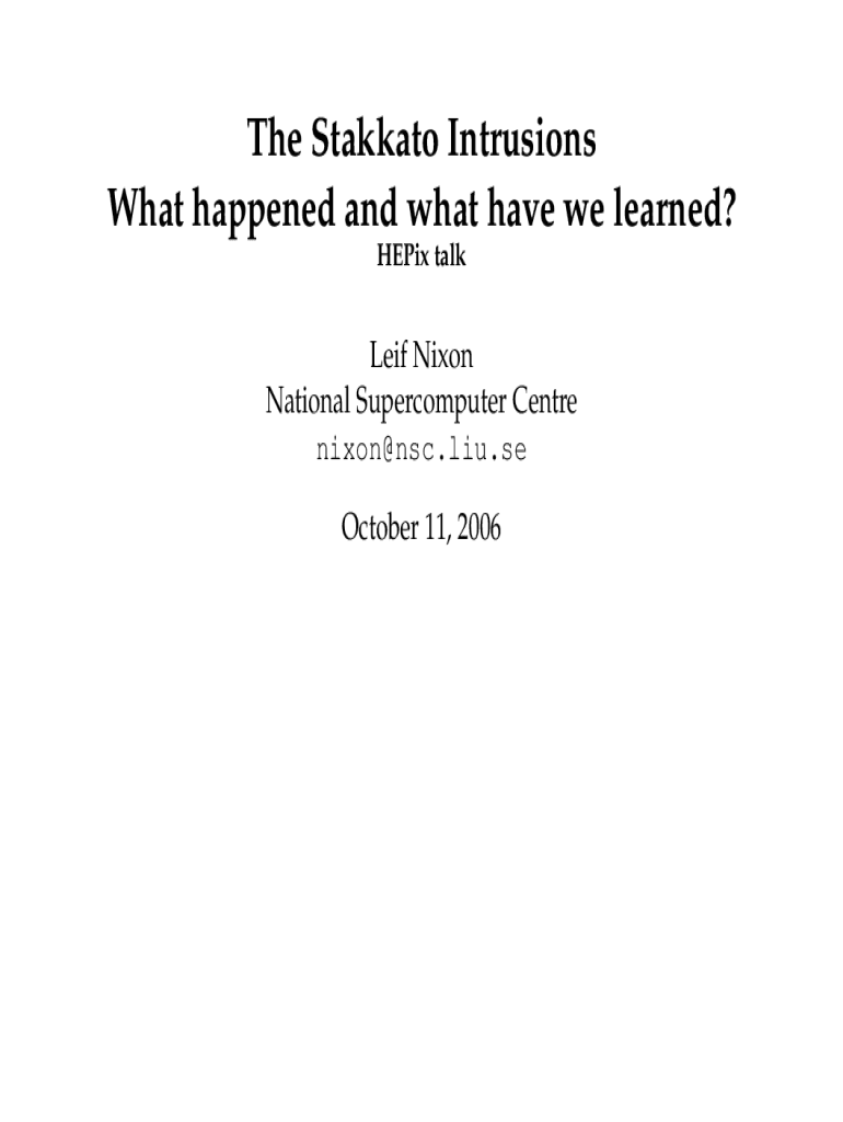 The Staccato Intrusions What happened, and what have we learned? Helix talk Leif Nixon National Supercomputer Center nixon@nsc.liu.se October 11, 2006May 2005Internet Attack Called Broad and Long