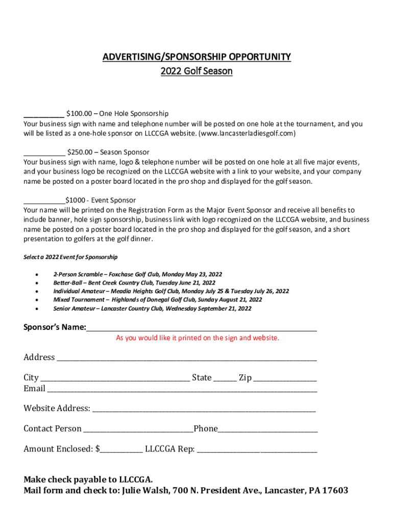 ADVERTISING/SPONSORSHIP OPPORTUNITY 2022 Golf Season___ $100.00 One Hole Sponsorship Your business sign with name and telephone number will be posted on one hole at the tournament, and you will be