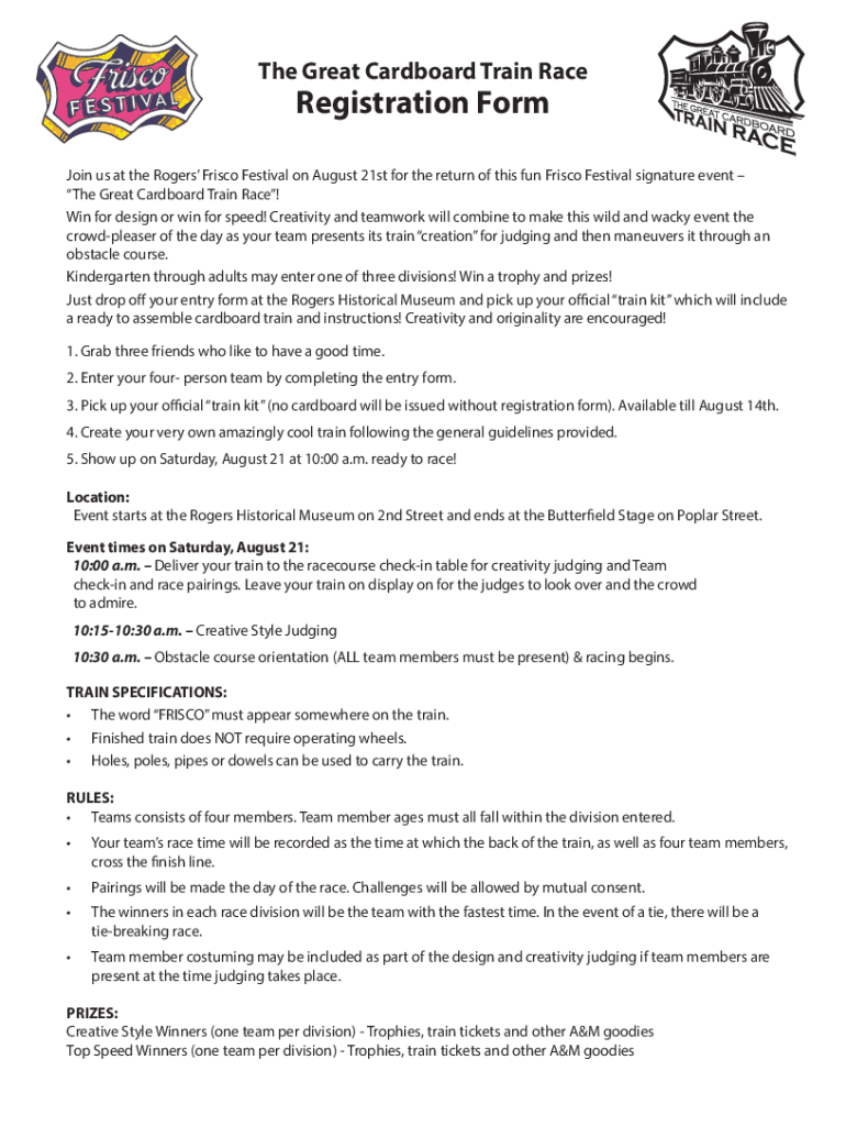 The Great Cardboard Train Preregistration Formalin us at the Rogers Frisco Festival on August 21st for the return of this fun Frisco Festival signature event The Great Cardboard Train Race! Win for