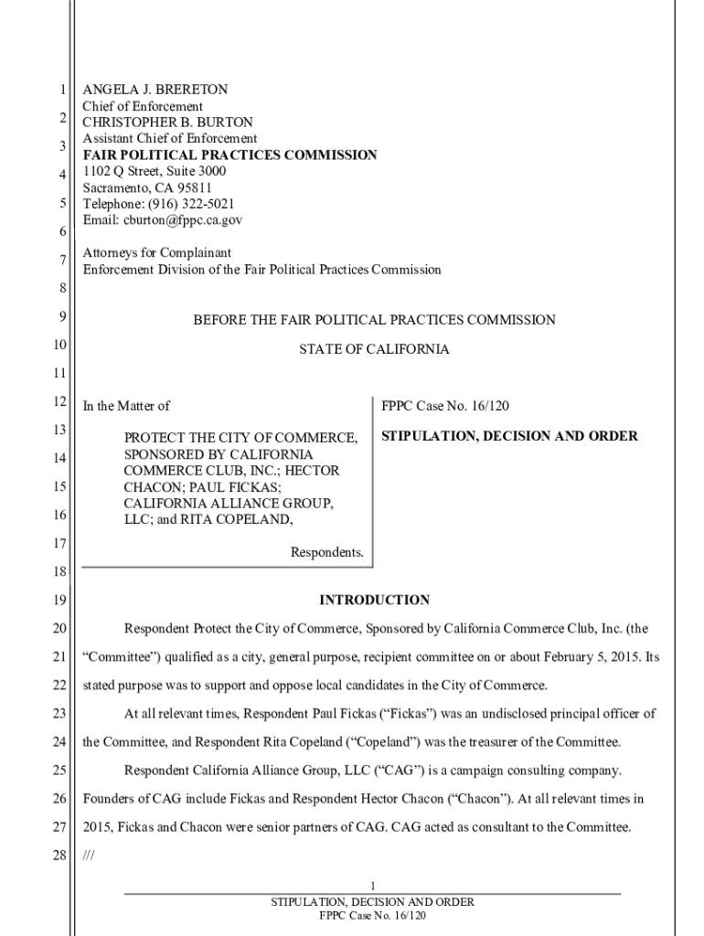 1 2 3 4 5 6 7ANGELA J. BRETON Chief of Enforcement CHRISTOPHER B. BURTON Assistant Chief of Enforcement FAIR POLITICAL PRACTICES COMMISSION 1102 Q Street, Suite 3000 Sacramento, CA 95811 Telephone: