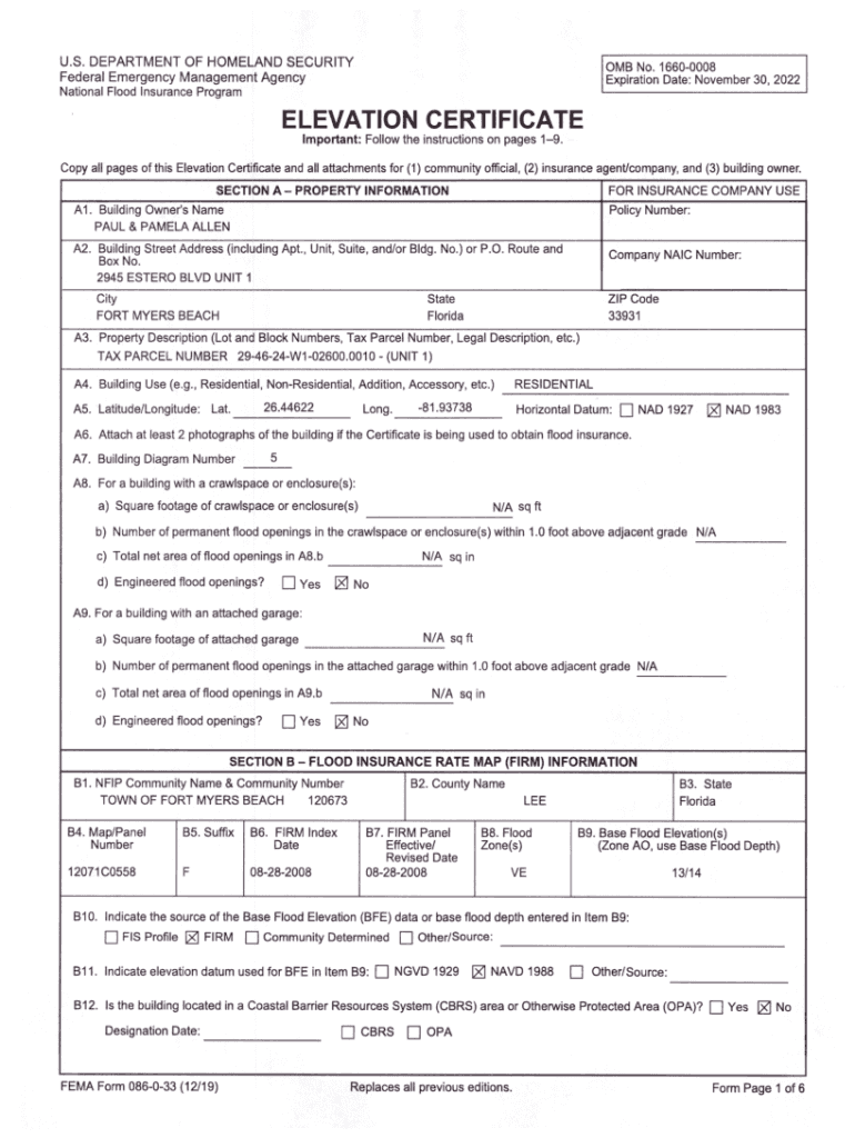 U.S. DEPARTMENT OF HOMELAND SECURITY Federal Emergency Management Agency OMB No. 16600008 Expiration Date: November 30, 2022National Flood Insurance ProgramELEVATION CERTIFICATE Important: Follow