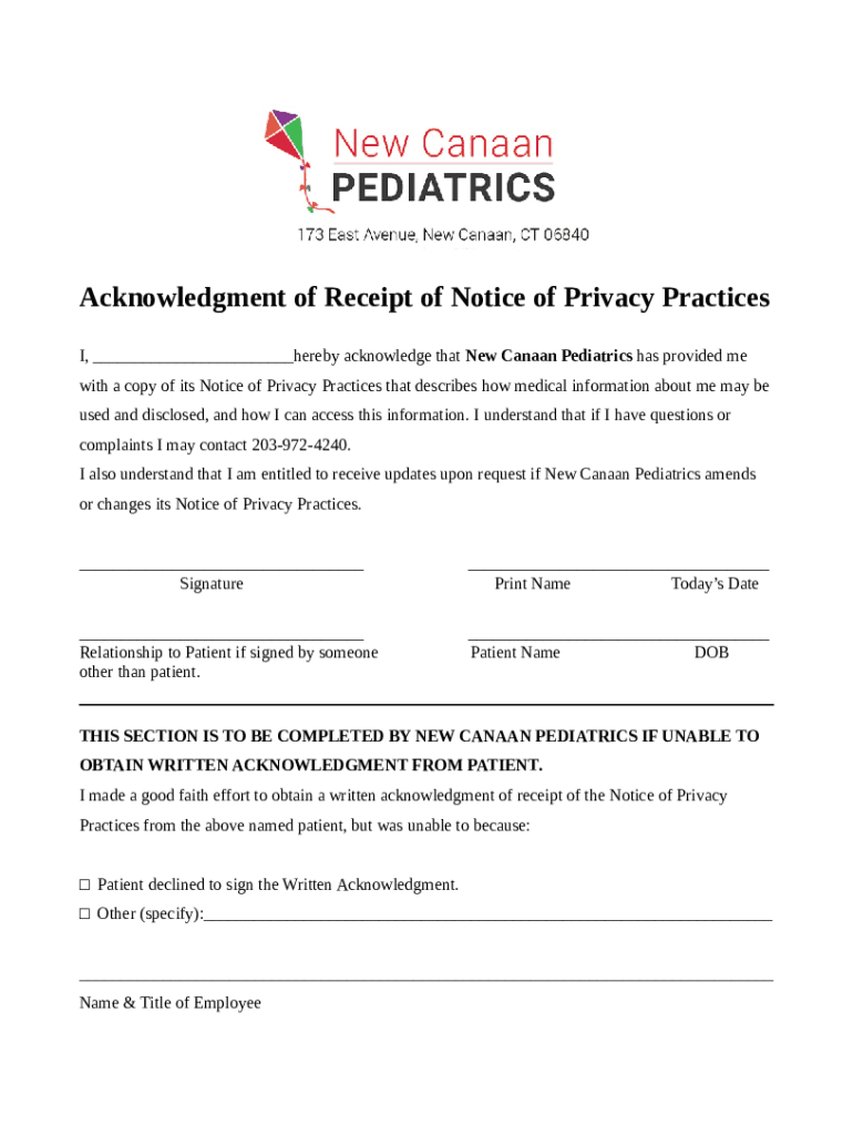 Acknowledgment of Receipt of Notice of Privacy Practices I, ___hereby acknowledge that New Canaan Pediatrics has provided me with a copy of its Notice of Privacy Practices that describes how medical