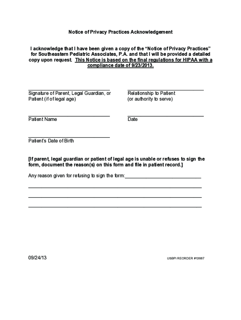 Notice of Privacy Practices Acknowledgement I acknowledge that I have been given a copy of the Notice of Privacy Practices for Southeastern Pediatric Associates, P.A. and that I will be provided a