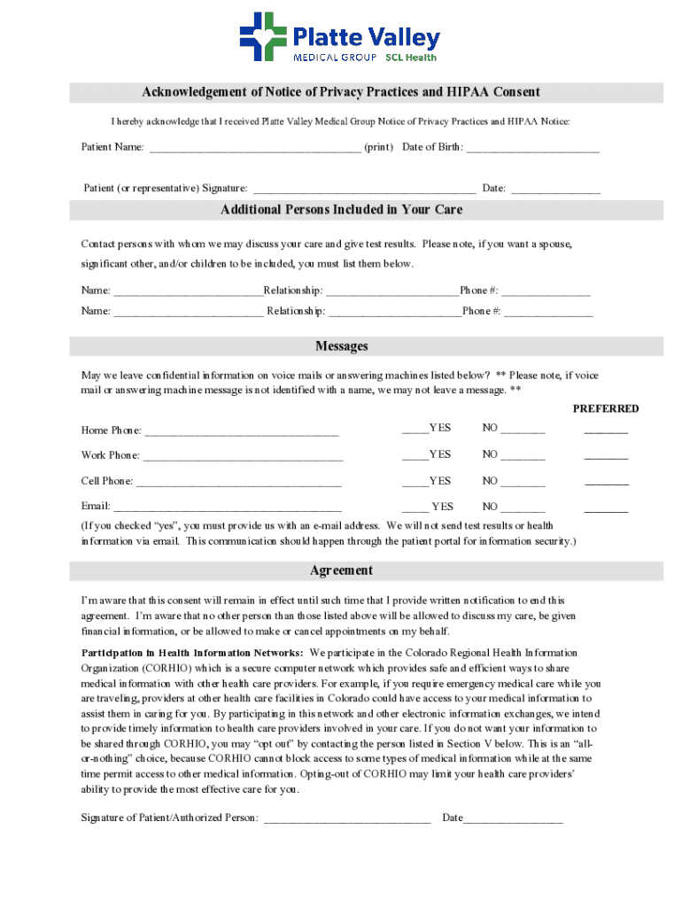 Acknowledgement of Notice of Privacy Practices and HIPAA Consent I hereby acknowledge that I received Platte Valley Medical Group Notice of Privacy Practices and HIPAA Notice:Patient Name: ___ (print)