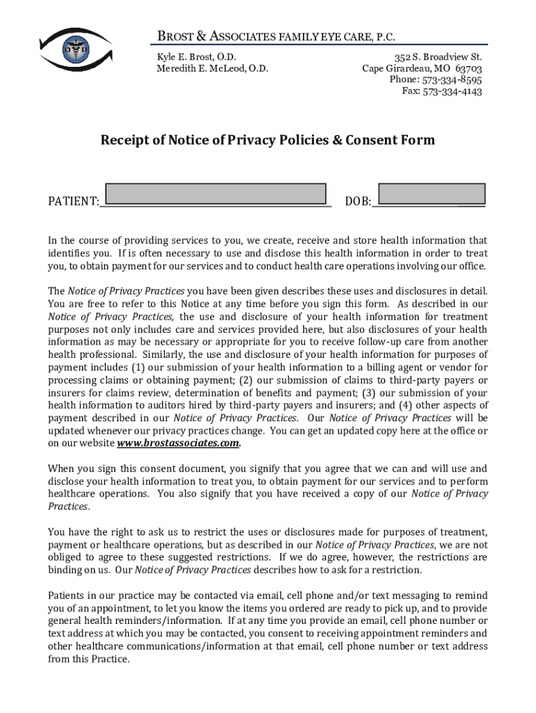 BOOST & ASSOCIATES FAMILY EYE CARE, P.C. Kyle E. Boost, O.D. Meredith E. McLeod, O.D.352 S. Broadview St. Cape Mirabeau, MO 63703 Phone: 5733348595 Fax: 5733344143Receipt of Notice of Privacy Policies