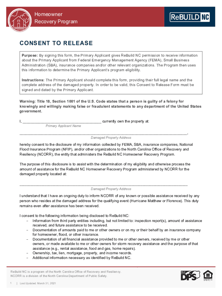 Homeowner Recovery ProgramCONSENT TO RELEASE Purpose: By signing this form, the Primary Applicant gives Rebuild NC permission to receive information about the Primary Applicant from Federal Emergency