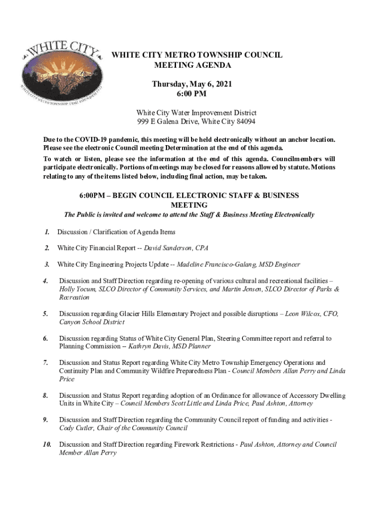 WHITE CITY METRO TOWNSHIP COUNCIL MEETING AGENDA Thursday, May 6, 2021 6:00 PM White City Water Improvement District 999 E Galena Drive, White City 84094 Due to the COVID-19 pandemic, this meeting