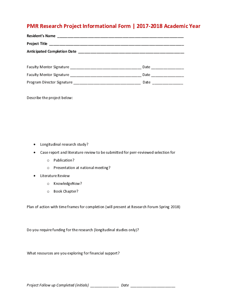 PMR Research Project Informational Form | 20172018 Academic Year Residents Name ___ Project Title ___ Anticipated Completion Date ___Faculty Mentor Signature ___ Date ___ Faculty Mentor Signature