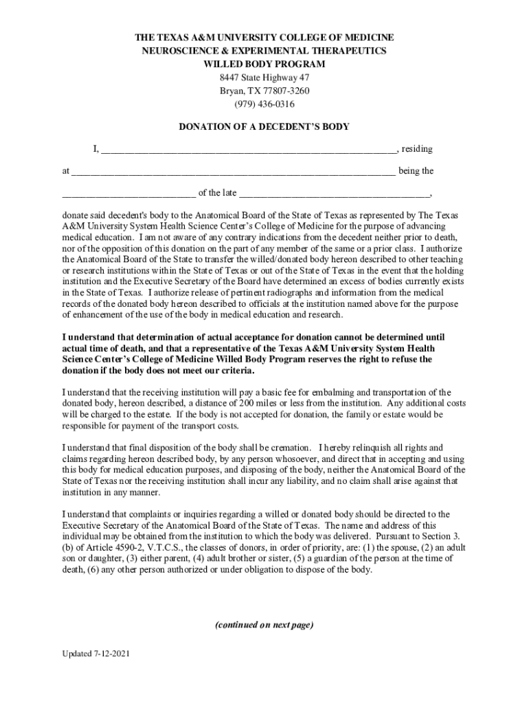 THE TEXAS A&M UNIVERSITY COLLEGE OF MEDICINE NEUROSCIENCE & EXPERIMENTAL THERAPEUTICS WILLED BODY PROGRAM 8447 State Highway 47 Bryan, TX 778073260 (979) 4360316 DONATION OF A DECEDENTS BODY I, ___,