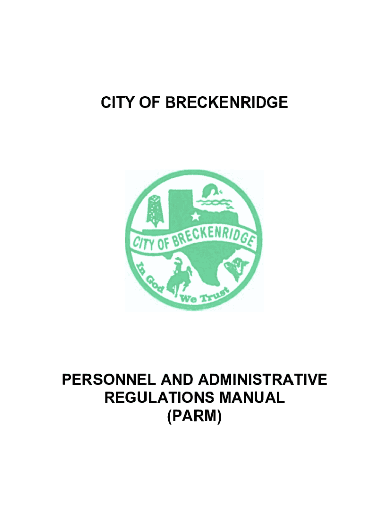 CITY OF BRECKENRIDGEPERSONNEL AND ADMINISTRATIVE REGULATIONS MANUAL (PART)MAY 2022 CITY OF BRECKENRIDGE PERSONNEL POLICY MANUAL Table of Contents CHAPTER 1 1.01 1.02 1.03 1.04 1.05 1.06 1.07 1.08