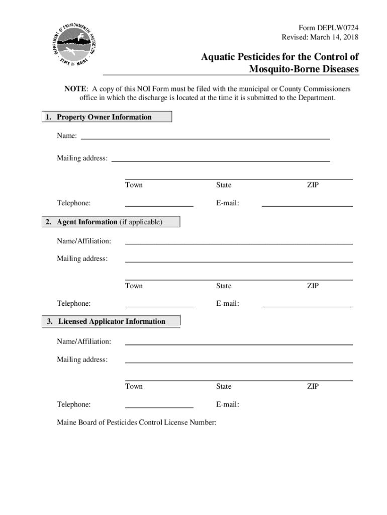 Form DEPLW0724 Revised: March 14, 2018Aquatic Pesticides for the Control of MosquitoBorne Diseases NOTE: A copy of this NOI Form must be filed with the municipal or County Commissioners' office in