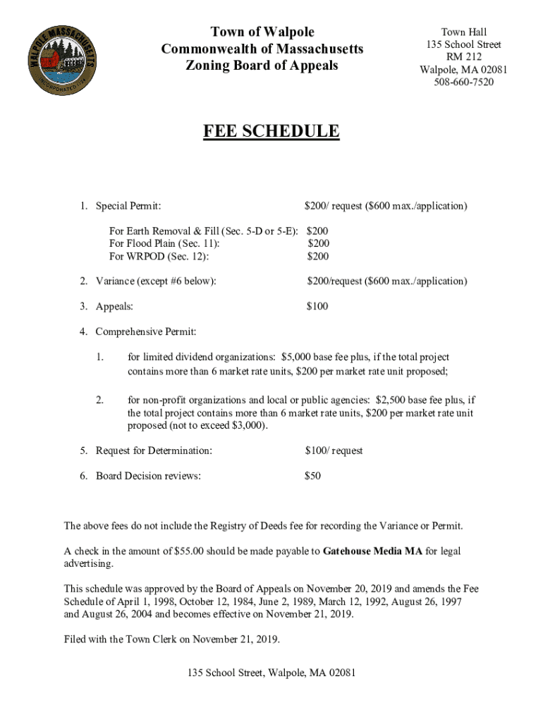 Town of Walpole Commonwealth of Massachusetts Zoning Board of AppealsTown Hall 135 School Street RM 212 Walpole, MA 02081 5086607520FEE SCHEDULE1. Special Permit:$200/ request ($600 max./application)For