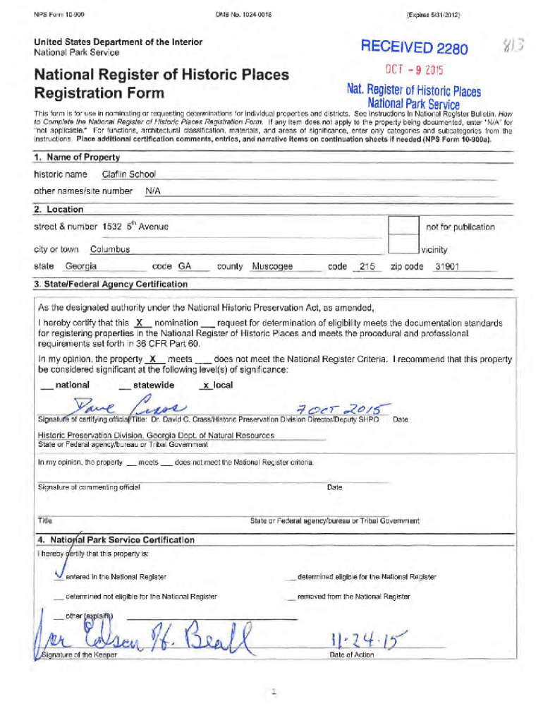 NPS Form 109000 MB No. 10240018(Expires 5/31/2012)United States Department of the Interior National Park ServiceRECEIVED 2280 OCT 9 2015National Register of Historic Places Registration Format. Register