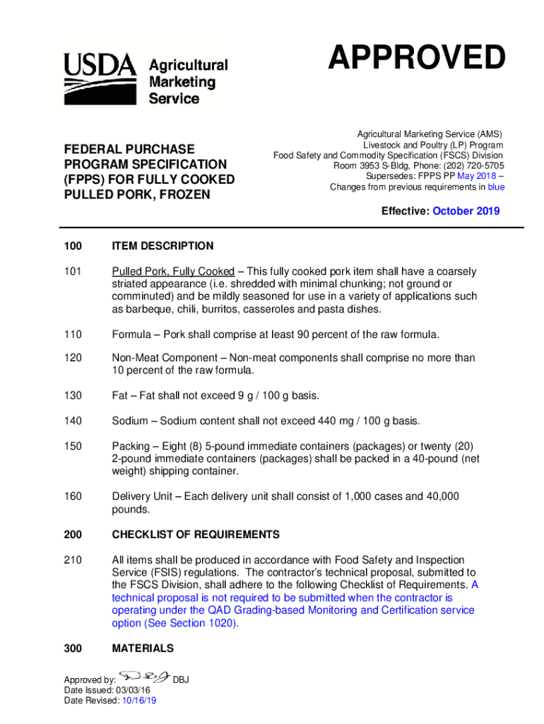 APPROVED FEDERAL PURCHASE PROGRAM SPECIFICATION (FPS) FOR FULLY COOKED PULLED PORK, FROZENAgricultural Marketing Service (AMS) Livestock and Poultry (LP) Program Food Safety and Commodity Specification