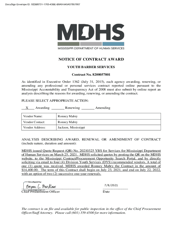 DocuSign Envelope ID: 92DB8731176343BEB9A9545A07857667NOTICE OF CONTRACT AWARD YOUTH BARBER SERVICES Contract No. 8200057801 As identified in Executive Order 1362 (July 31, 2015), each agency awarding,