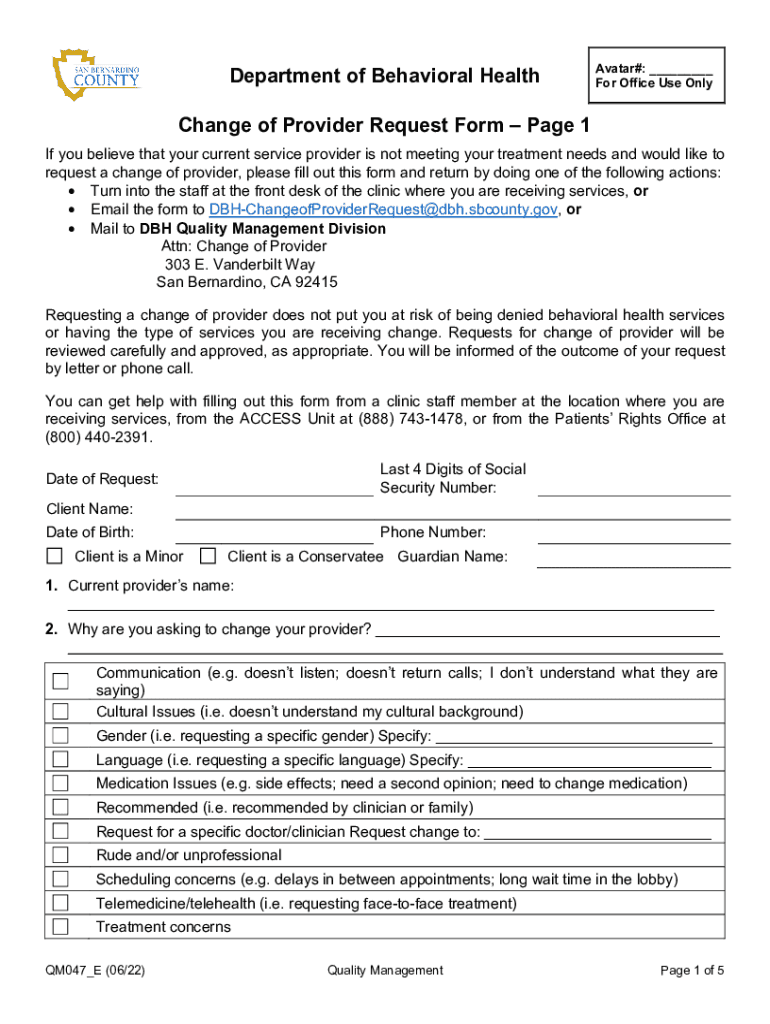 ResetDepartment of Behavioral HealthAvatar#: ___ For Office Use OnlyChange of Provider Request Form Page 1 If you believe that your current service provider is not meeting your treatment needs and