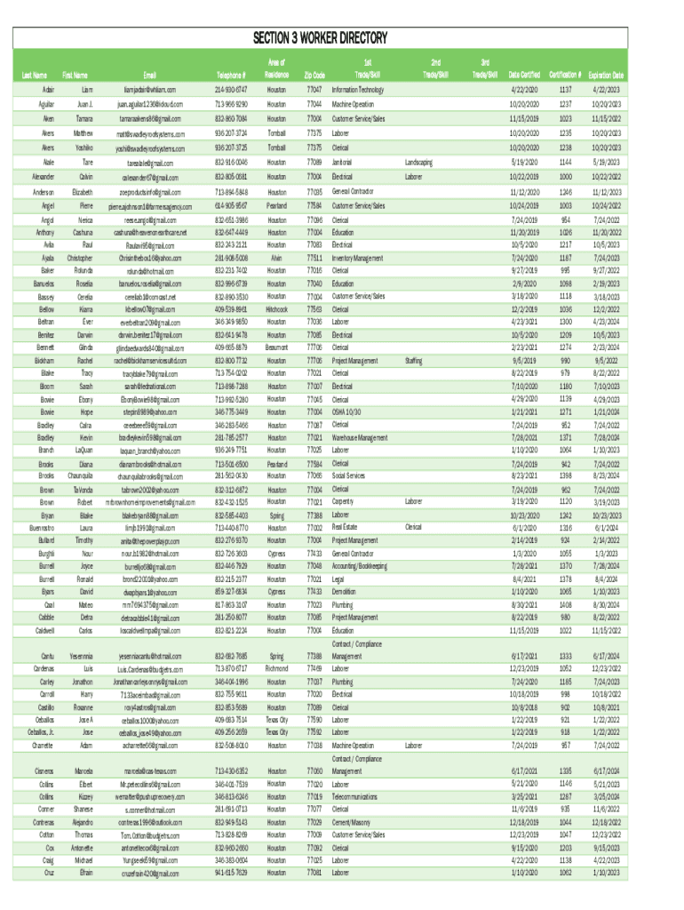 SECTION 3 WORKER DIRECTORY Last NameFirst NameAdairLiamAguilarJuan J. EmailTelephone #Area of Residence Code1st Trade/Skill2nd Trade/Skill3rd Trade/Silicate CertifiedCertification #liamjadair@whliam.com2149306747Houston77047Information