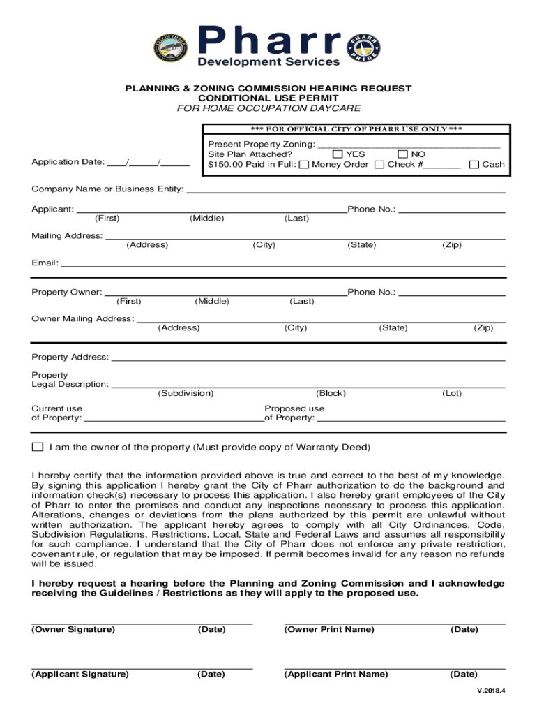 PLANNING & ZONING COMMISSION HEARING REQUEST CONDITIONAL USE PERMIT FOR HOME OCCUPATION DAYCARE *** FOR OFFICIAL CITY OF PARR USE ONLY ***Application Date:/Present Property Zoning: ___ Site Plan Attached?