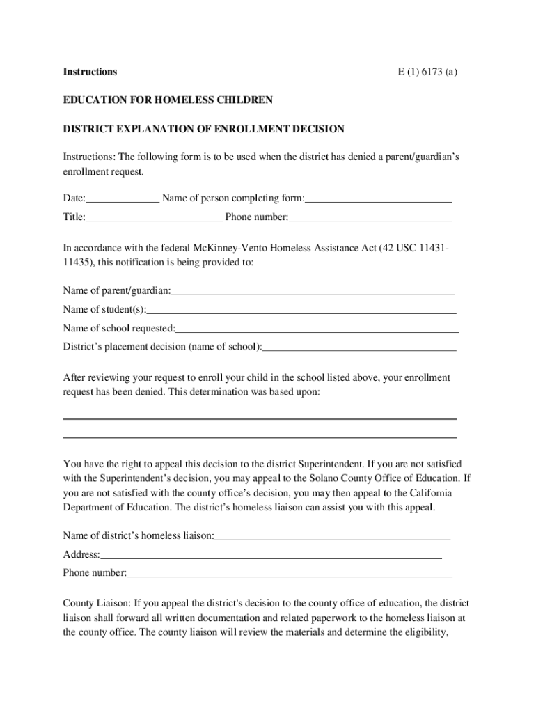 Instructions (1) 6173 (a)EDUCATION FOR HOMELESS CHILDREN DISTRICT EXPLANATION OF ENROLLMENT DECISION Instructions: The following form is to be used when the district has denied a parent/guardians