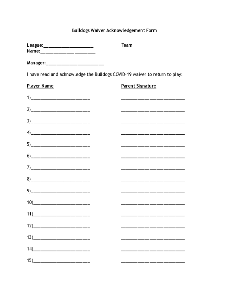 Bulldogs Waiver Acknowledgement Form! League:___ Name:___Team15)______! Manager:___ ! I have read and acknowledge the Bulldogs COVID-19 waiver to return to play: ! Player Name Parent Signature ! 1)___