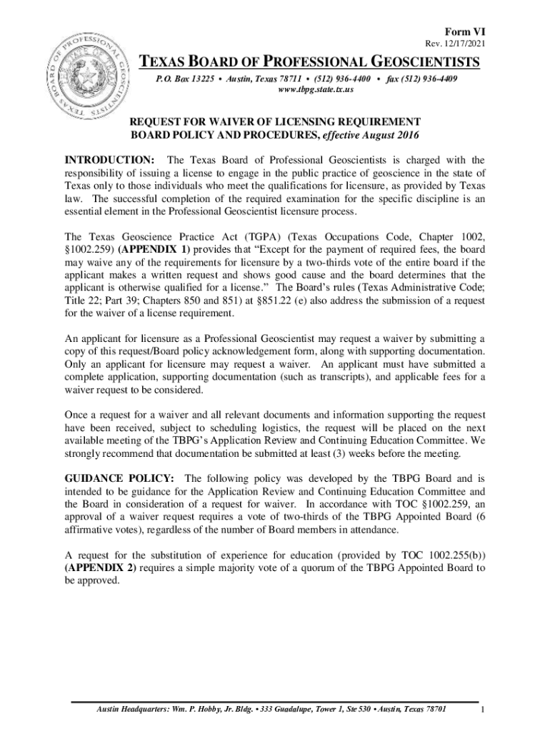 Form VI Rev. 12/17/2021TEXAS BOARD OF PROFESSIONAL GEOSCIENTISTS P.O. Box 13225 Austin, Texas 78711 (512) 9364400 fax (512) 9364409 www.tbpg.state.tx.usREQUEST FOR WAIVER OF LICENSING REQUIREMENT