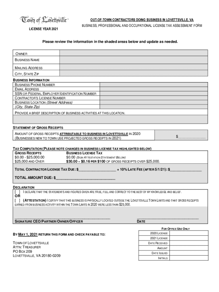 Out-of-town contractors who are conducting business in Lovettsville are required to file this form.