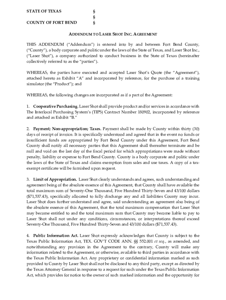 STATE OF TEXAS COUNTY OF FORT BEND ADDENDUM TO LASER SHOT INC. AGREEMENT THIS ADDENDUM (Addendum) is entered into by and between Fort Bend County, (County), a body corporate and politic under the
