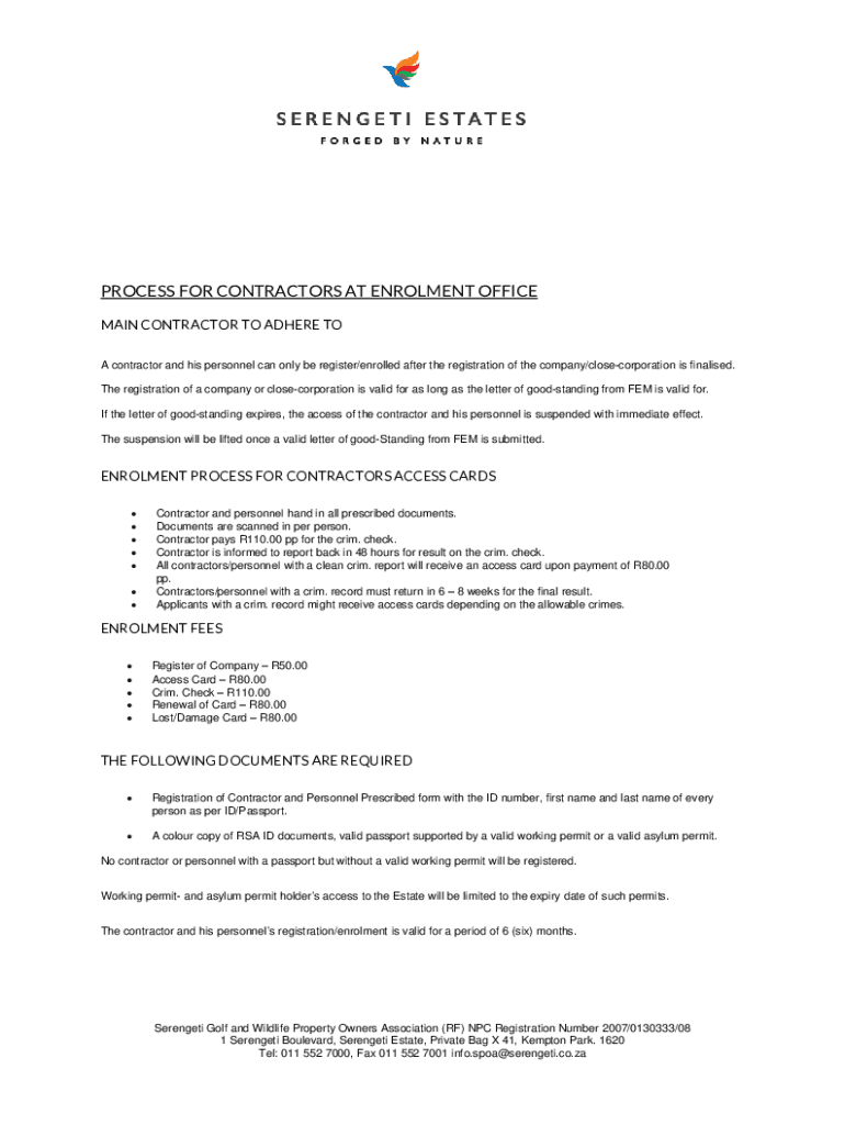 Get the free serengeti-estates.co.zawp-contentuploadsPROCESS FOR CONTRACTORS AT ENROLMENT OFFICE ...