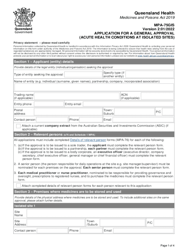 Application form General approval (acute health conditions at isolated sites) Initial application January 2022Information about this application from This application form is to be used to apply for