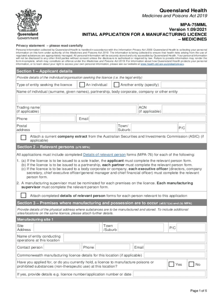 Application form Manufacturing license (medicines) Initial application September 2021Information about this application from This application form is to be used to apply for a license to manufacture
