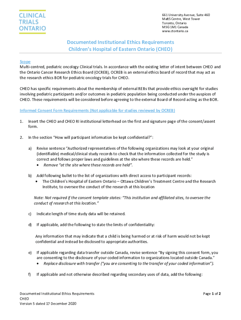 661 University Avenue, Suite 460 MaRS Center, West Tower Toronto, Ontario M5G 1M1 Canada www.ctontario.caDocumented Institutional Ethics Requirements Children's Hospital of Eastern Ontario (CHEN)