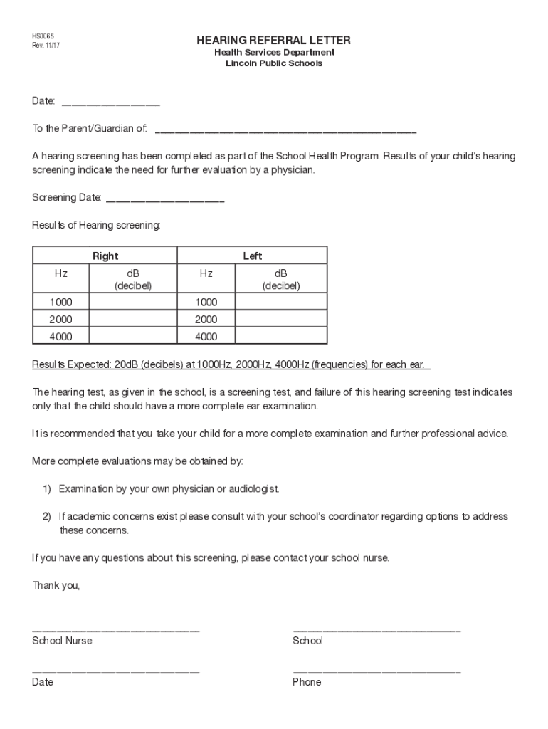 HS0065 Rev. 11/17HEARING REFERRAL LETTER Health Services Department Lincoln Public Schoolmate: ___ To the Parent/Guardian of: ___ A hearing screening has been completed as part of the School Health