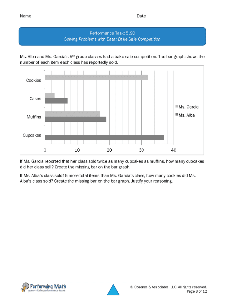 Name ___ Date ___Performance Task: 5.9C Solving Problems with Data: Bake Sale Competitions. Alba and Ms. Garcia's 5th grade classes had a bake sale competition. The bar graph shows the number of each