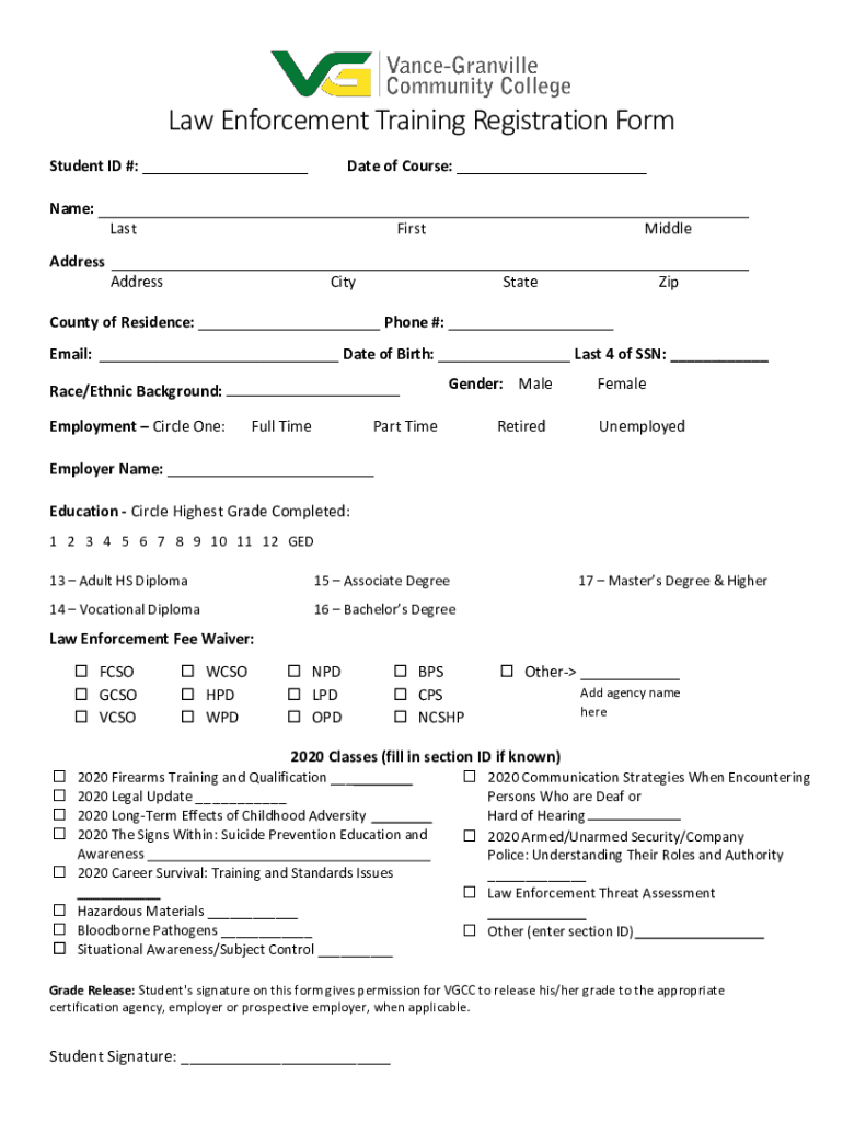 Law Enforcement Training Registration Form Student ID #: ___ Name: Addressable of Course: ___LastFirstAddressMiddleCityStateZipCounty of Residence: ___ Phone #: ___ Email: ___ Date of Birth: ___ Last