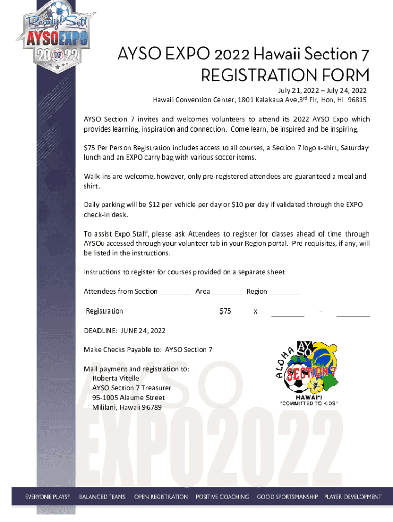 ALSO, EXPO 2022 Hawaii Section 7 REGISTRATION FORM July 21, 2022, July 24, 2022, Hawaii Convention Center, 1801 Katakana Ave,3rd FLR, Hon, HI 96815AYSO Section 7 invites and welcomes volunteers to