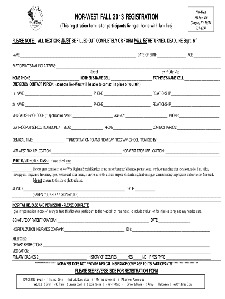 FOREST FALL 2013 REGISTRATION (This registration form is for participants living at home with families)Nor West PO Box 420 Rulers, NY 10521 7374797PLEASE NOTE: ALL SECTIONS MUST BE FILLED OUT COMPLETELY