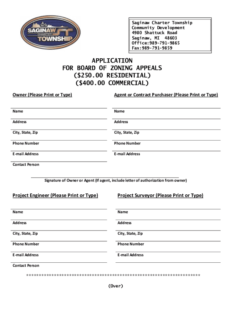 Saginaw Charter Township Community Development 4980 Attack Road Saginaw, MI 48603 Office:9897919865 Fax:9897919859APPLICATION FOR BOARD OF ZONING APPEALS ($250.00 RESIDENTIAL) ($400.00 COMMERCIAL)