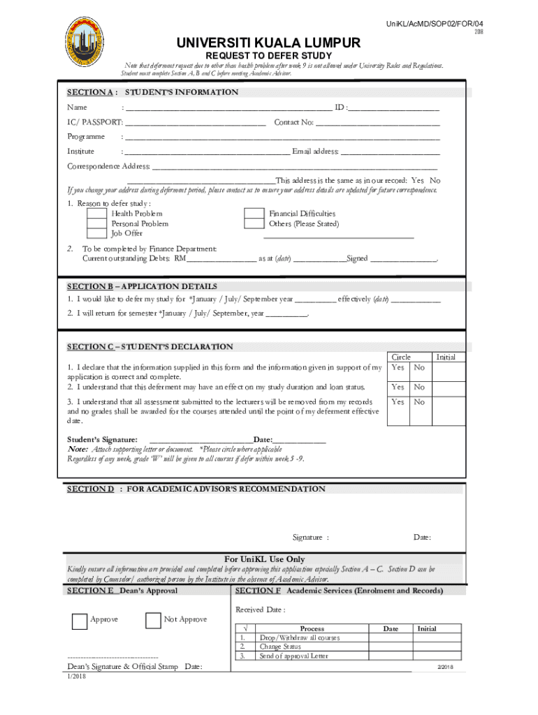 UNIL/Acid/SOP02/FOR/04 2018UNIVERSITI KUALA LUMPUR REQUEST TO DEFER STUDY Note that deferment request due to other than health problem after week 9 is not allowed under University Rules and Regulations.