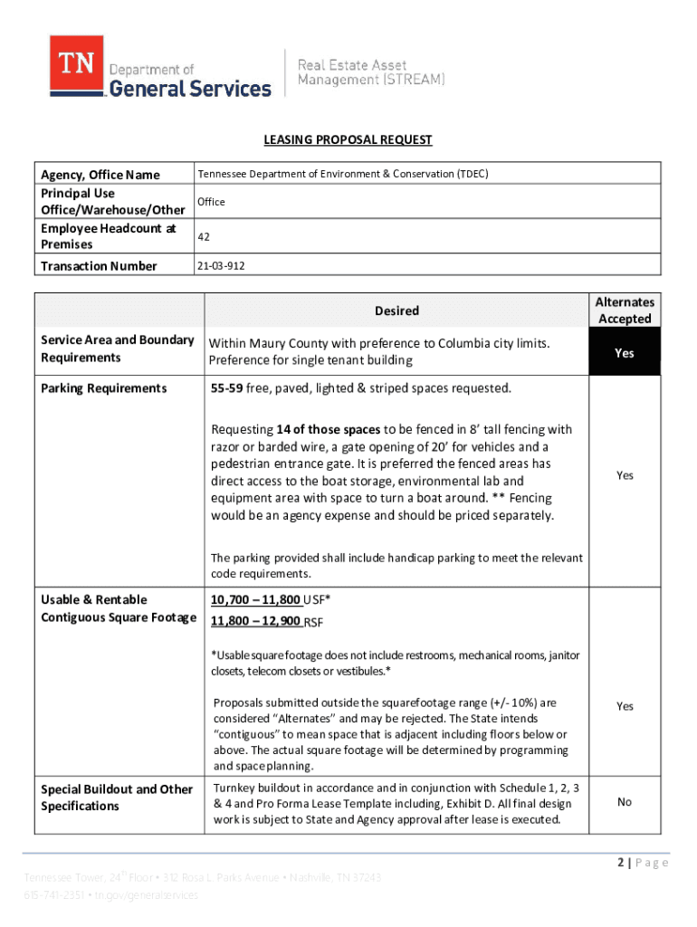 LEASING PROPOSAL REQUEST Tennessee Department of Environment & Conservation (DEC) Agency, Office Name Principal Use Office/Warehouse/Other Employee Headcount at 42 PremisesTransaction Number2103912Desired