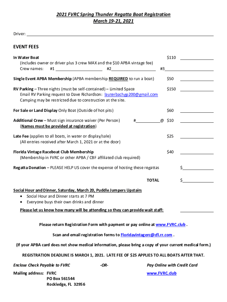 2021 FRC Spring Thunder Regatta Boat Registration March 1921, 2021 Driver: ___EVENT FEES In Water Boat (Includes owner or driver plus 3 crew MAX and the $10 APA vintage fee) Crew names: #1 ___ #2___$110