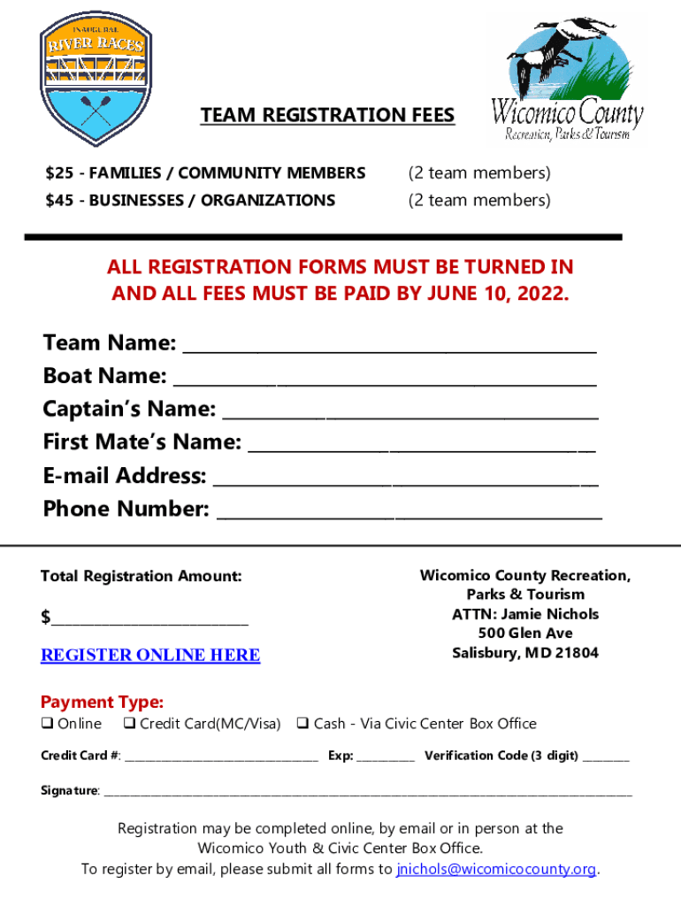 Date: June 18, 2022, Time: 2:00pm Cardboard Boat Race Spectacular Official Team Registration PacketTEAM REGISTRATION FEES $25 FAMILIES / COMMUNITY MEMBERS(2 team members)$45 BUSINESSES / ORGANIZATIONS(2