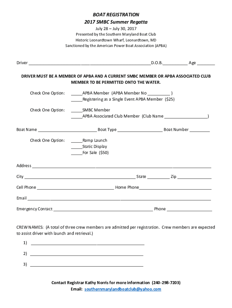 BOAT REGISTRATION 2017 SMBC Summer Regatta July 28 July 30, 2017, Presented by the Southern Maryland Boat Club Historic Leonard town Wharf, Leonard town, MD Sanctioned by the American Power Boat Association