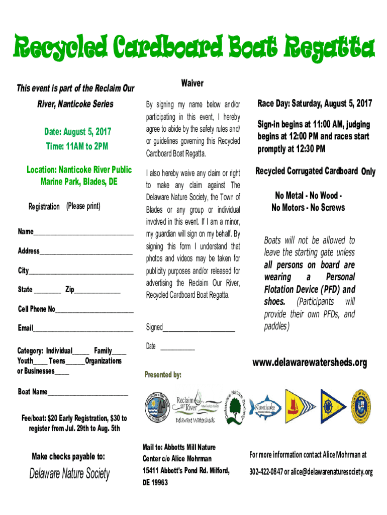Recycled Cardboard Boat Regatta This event is part of the Reclaim Our River, Manticore Series Date: August 5, 2017, Time: 11AM to 2PM Location: Manticore River Public Marine Park, Blades, DE Registration(Please