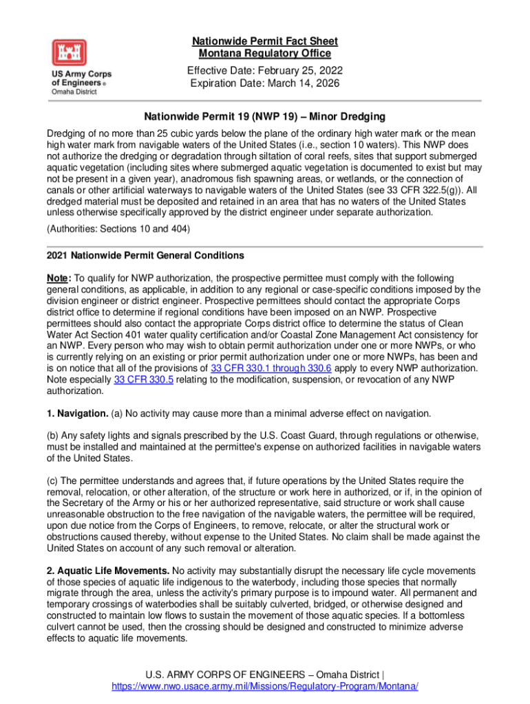 Nationwide Permit Fact Sheet Montana Regulatory Office Effective Date: February 25, 2022, Expiration Date: March 14, 2026, Nationwide Permit 19 (NP 19) Minor Dredging of no more than 25 cubic yards