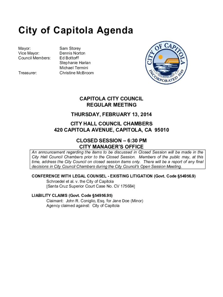 City of Capitol Agenda Mayor: Vice Mayor: Council Members:Treasurer:Sam Story Dennis Norton Ed Bottom Stephanie Harlan Michael Termini Christine McBroomCAPITOLA CITY COUNCIL REGULAR MEETING THURSDAY,