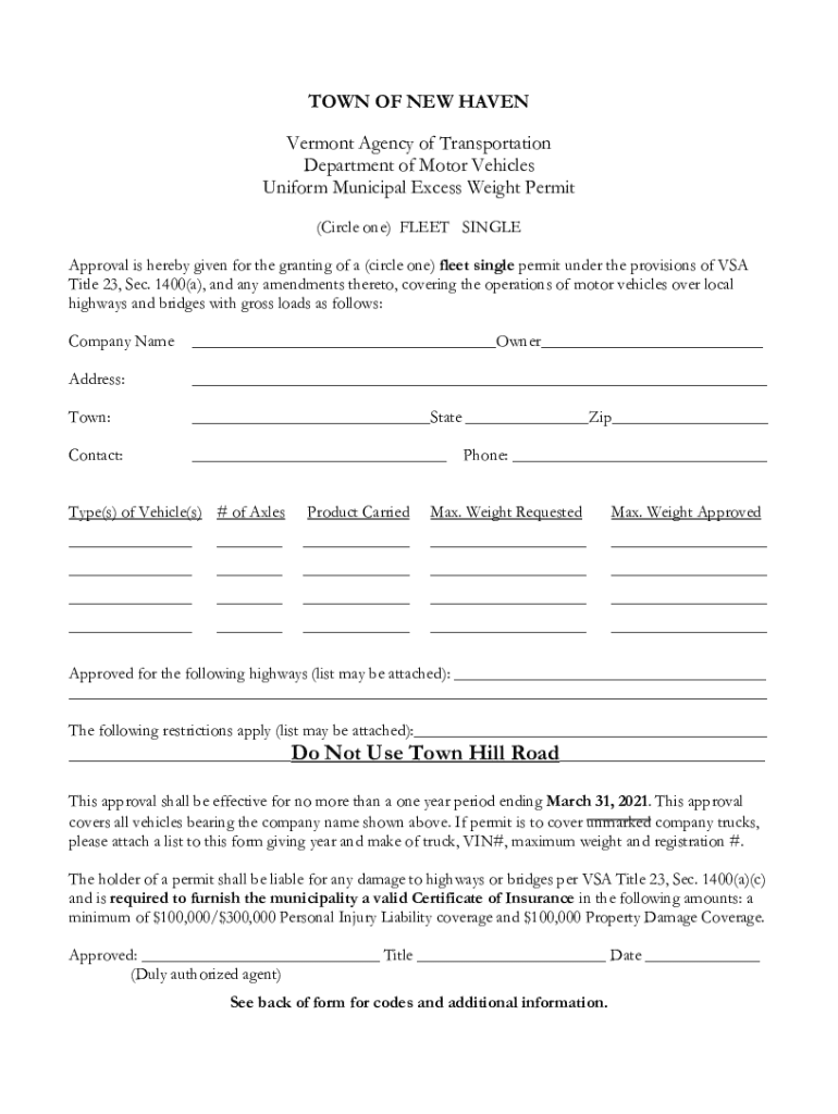 TOWN OF NEW HAVEN Vermont Agency of Transportation Department of Motor Vehicles Uniform Municipal Excess Weight Permit (Circle one) FLEET SINGLE Approval is hereby given for the granting of a (circle