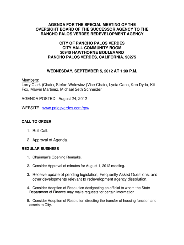 AGENDA FOR THE SPECIAL MEETING OF THE OVERSIGHT BOARD OF THE SUCCESSOR AGENCY TO THE RANCHO PALOS VERDES REDEVELOPMENT AGENCY CITY OF RANCHO PALOS VERDES CITY HALL COMMUNITY ROOM 30940 HAWTHORNE BOULEVARD