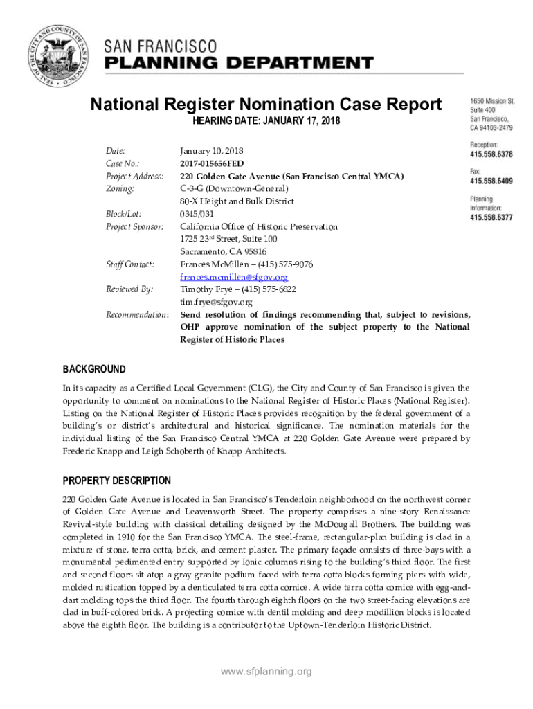National Register Nomination Case Report HEARING DATE: JANUARY 17, 2018, Date: Case No.: Project Address: Zoning: Block/Lot: Project Sponsor:Staff Contact: Reviewed By: Recommendation:January 10,