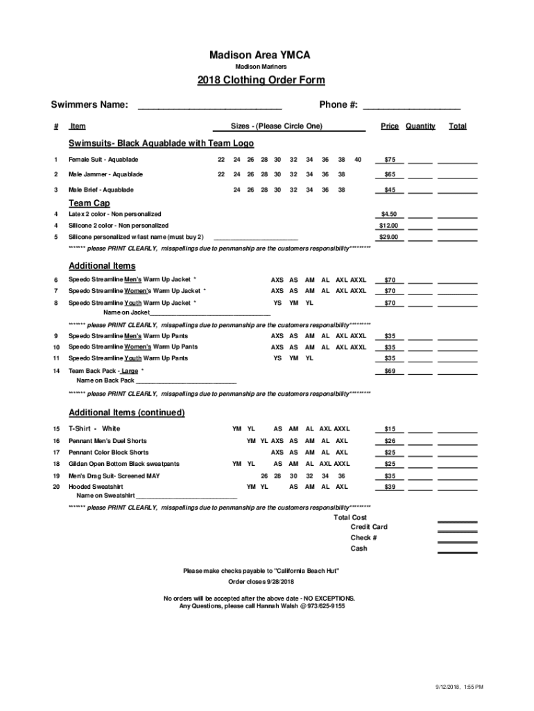 Madison Area YMCA Madison Mariners2018 Clothing Order Form Swimmers Name: #___Interphone #: ___Sizes (Please Circle One)Price QuantityTotalSwimsuits Black Aqua blade with Team Logo 1Female Suit Aquablade$22242628303234363840752Male