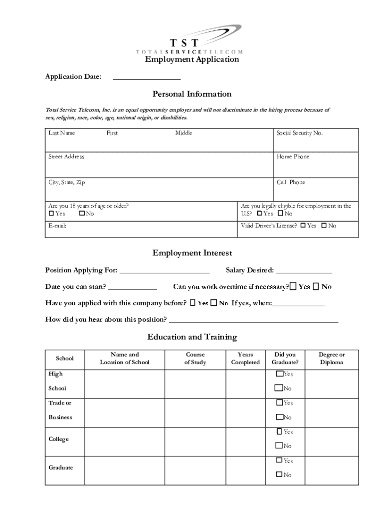 Employment Application Date:___Personal Information Total Service Telecom, Inc. is an equal opportunity employer and will not discriminate in the hiring process because of sex, religion, race, color,